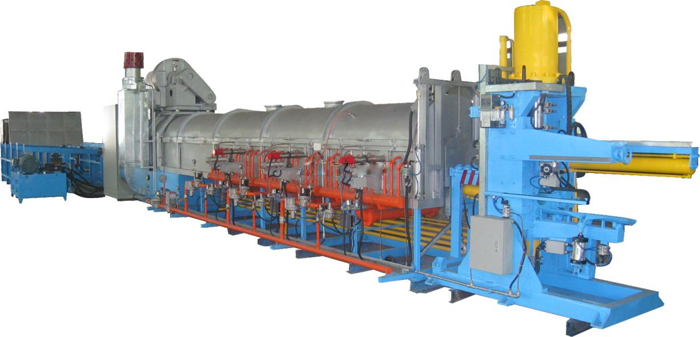 隧道式鋁錠加熱爐(熱剪爐)適用于鋁合金鑄錠(圓棒)的熱剪及在擠型前的鋁錠加熱。